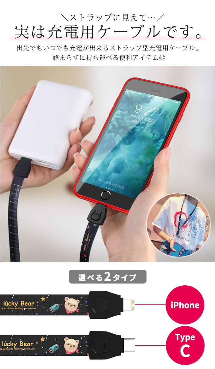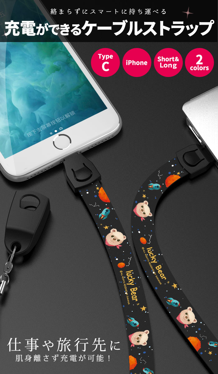 iphone 充電ケーブル ストラップ type-C 重電ケーブル ショート ロング ハンド ケーブル収納 ケース スマホ usb 落下防止 急速充電 データ転送 メジャー 【痛くない!】ネックストラップ 仕事 ビジネス キーホルダー 可愛い 熊 クマ ベアー【YUPT】
