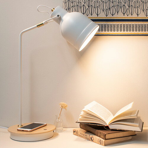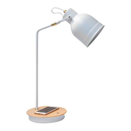 コロンとした丸いランプのフォルムと、木目調のワイヤレス充電器部分が モダンなデザイン。