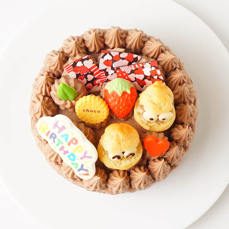 (冷蔵庫から出したすぐは少し硬めのクリームになります) 生クリームとチョコレートを独自の配合でブレンドした濃厚なガナッシュクリームで作ったホールケーキです! シュー生地のオリジナル人形と可愛いチョコオーナメントをトッピング! 砂糖菓子で作られた、かわいい「Happy Birthday」のプレートが付きます。
