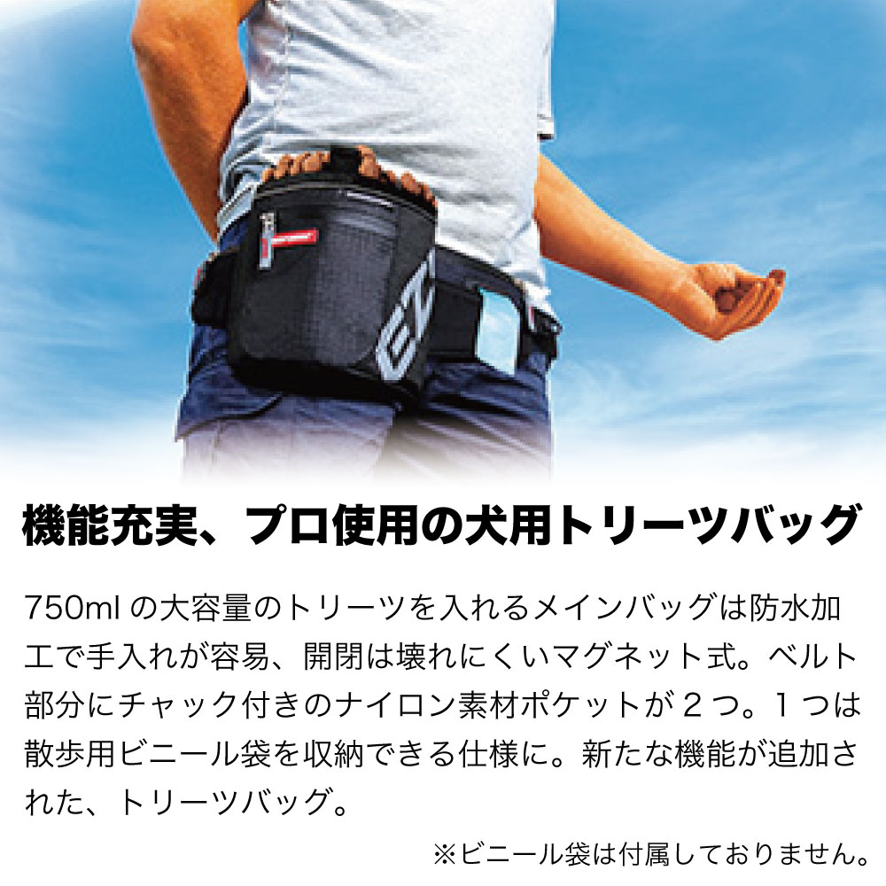 750mlの大容量のトリーツを入れるメインバッグは防水加工で手入れが容易! 開閉は壊れにくいマグネット式です。